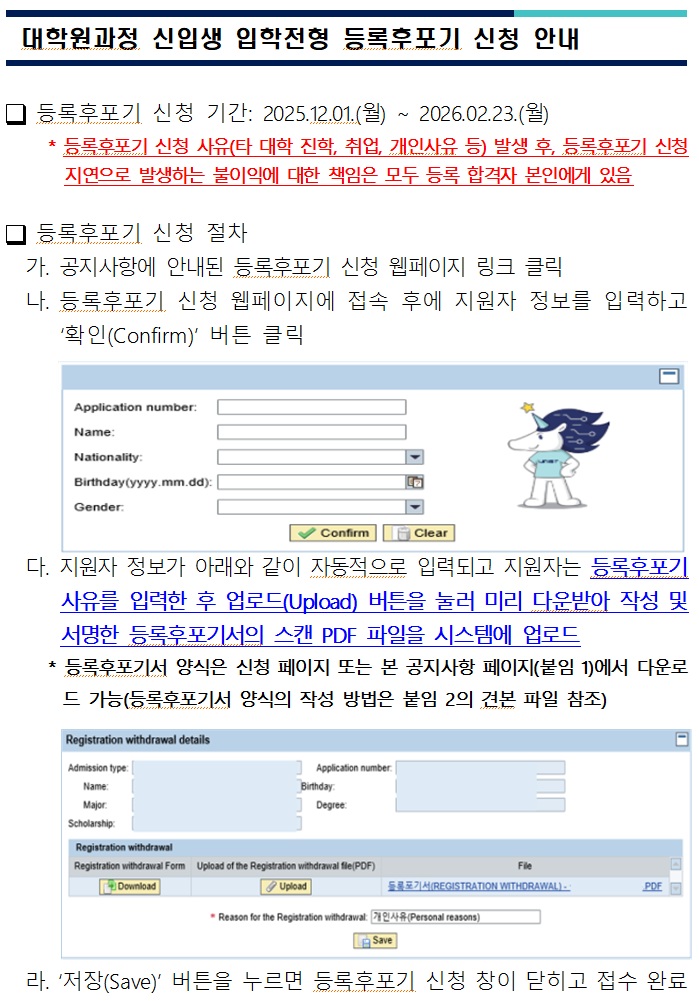 – 2026학년도 전기1차 등록후포기 신청 기간: 2025.12.01.(월)~2026.02.23.(월)